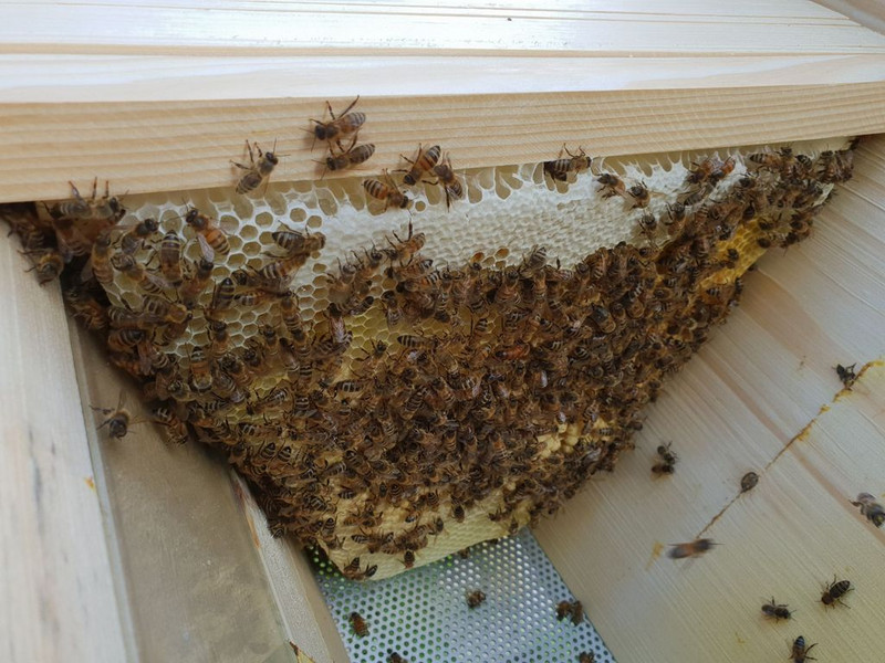 Bei unserer heutigen Beobachtung durch die Sichtscheibe haben wir gesehen, dass unser Volk sehr fleißg gebaut hat. Wir haben uns danach entschieden, ihnen mehr Platz zu geben und den Brutraum zu erweitern.