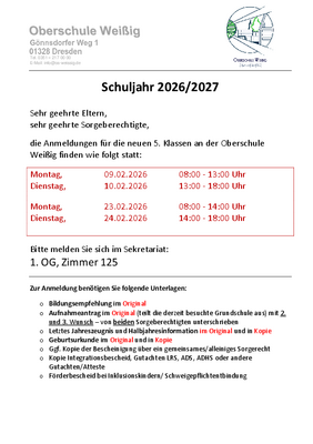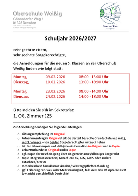news einzelansicht Neuigkeiten-Detailansicht Anmeldungen für die neuen 5. Klassen Sehr geehrte Eltern, sehr geehrte Sorgeberechtigte, die Anmeldungen für die neuen 5. Klassen an der Oberschule Weißig finden wie folgt statt: Zurück