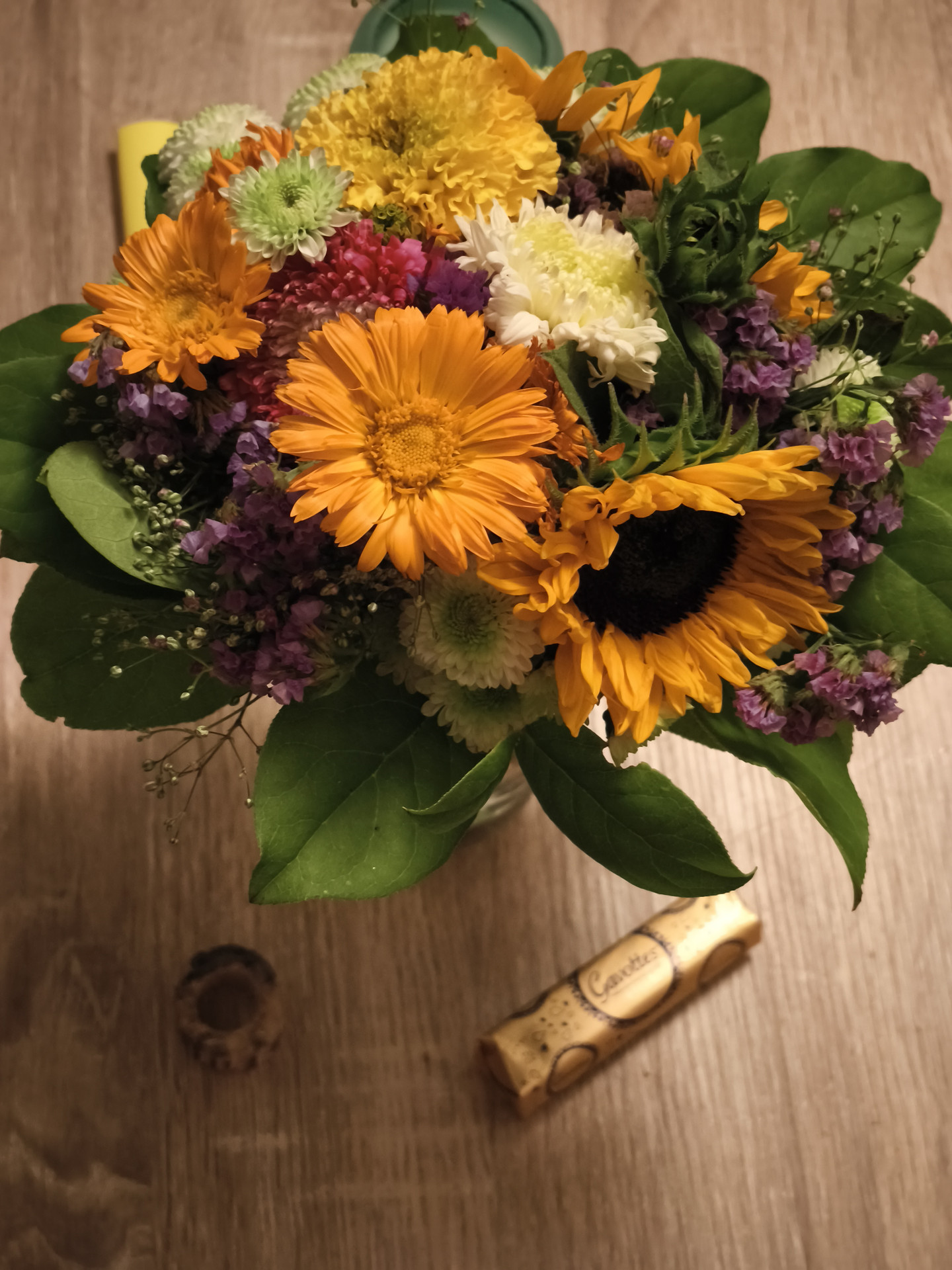 Diesen wunderschönen Blumenstrauß band ein Mädchen in Ihrem ersten Praktikum in einem freitaler Blumenladen. In folgendem Link finden Sie das Ergebnis.