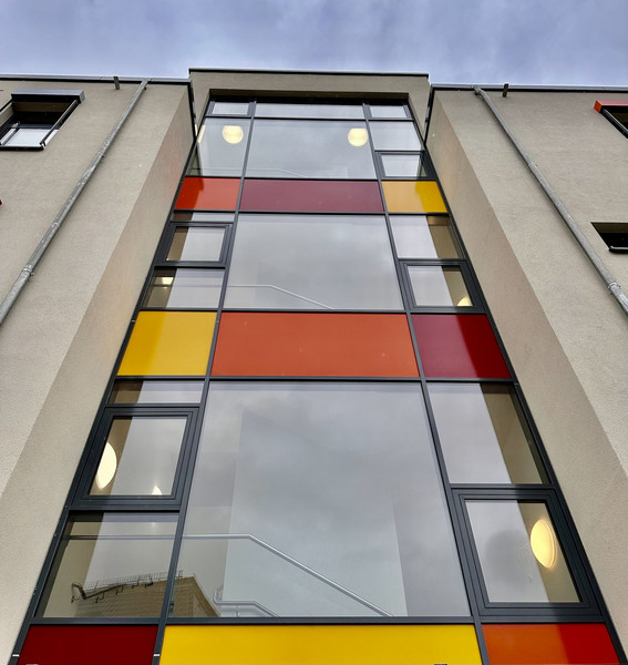 Unser farbenfrohes Schulgebäude kann auch aus einiger Entfernung erkannt werden.