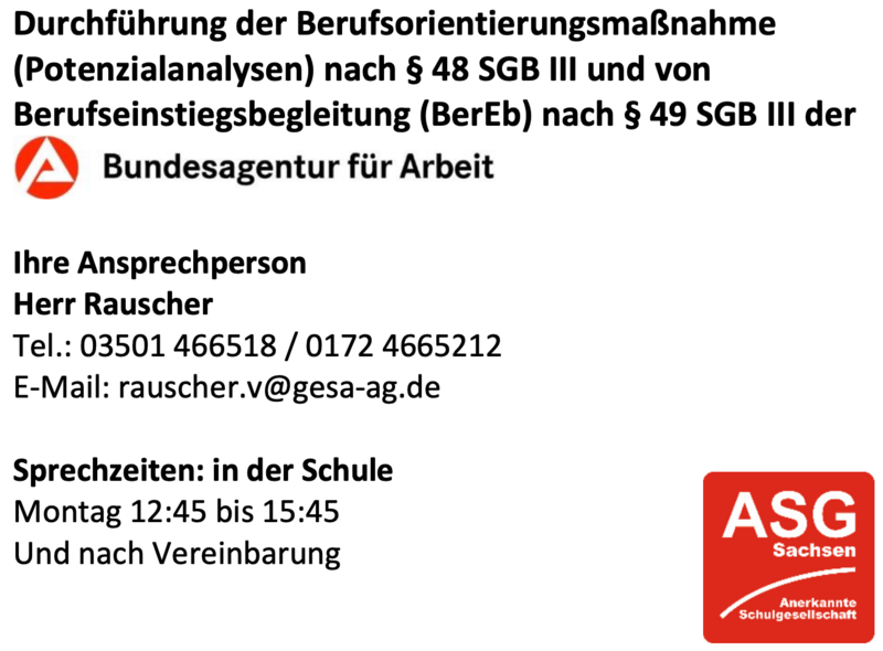 An unserer Oberschule sind Berufseinstiegsbegleiter ("BerEb") tätig. Die Berufseinstiegsbegleitung unterstützt einzelne Hauptschülerinnen und Hauptschüler mit besonderem Bedarf an Unterstützung während der 8. und 9. Klasse bezüglich der Berufsorientierung und bei der Ausbildungssuche. Auch die ersten Monate nach dem Schulabschluss ist die Berufseinstiegsbegleitung zur Unterstützung da.