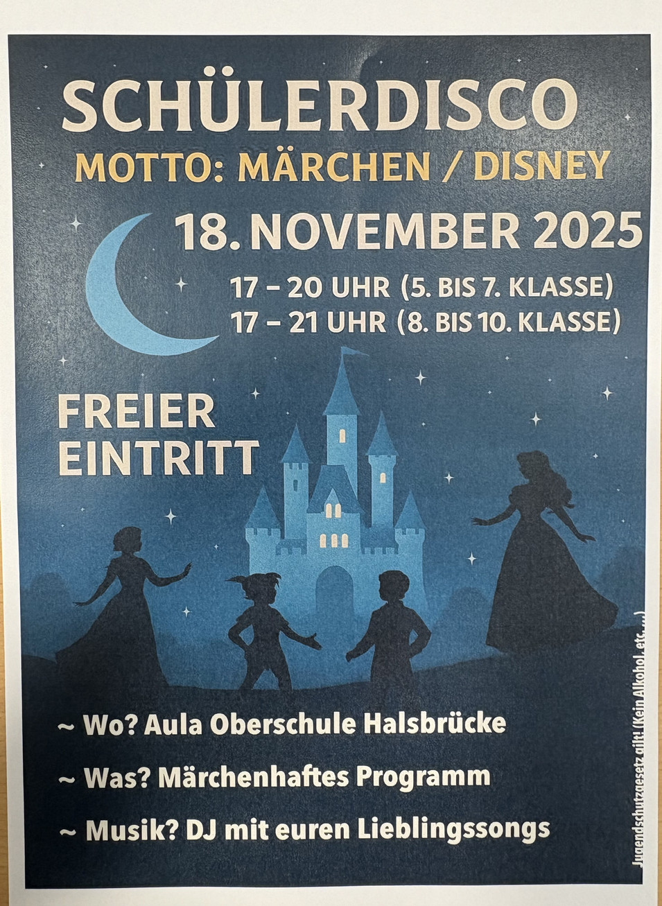 Am 19.11. fand unsere jährliche Schuldisco statt. Wie jedes Jahr wurde die Schuldisco von den 9. Klassen organisiert. Das Motto in diesem Jahr war „Gruppenkostüme“. Die Fotowand, welche von den Klassen 9 aufgebaut worde, hat jedes Foto wunderschön hervorgehoben. Es gab viele schöne Programmpunkte und 2 Schülerinnen der 9. Klasse haben alle wundervoll durch den Abend begleitet. Kurz vor 18:00 Uhr haben wir eine runde Stuhltanz gespielt und dadurch ein bisschen Stimmung in den Raum gebracht. Der nächste Punkt in unserem Programm war eine Kostümpremiere, bei der uns netterweise Lehrer geholfen haben, die Entscheidung zu treffen. Kurz bevor uns 20:00 Uhr die Klassen 5-7 verlassen mussten, haben wir noch eine Runde Limbo gespielt. Um 21:00 Uhr war für alle Schüler Schluss. Wir fanden, es war ein wundervoller Abend und haben uns über jeden gefreut der da war. Ich bedanke mich bei allen, die bei der Organisation sowie beim Auf- und Abbau geholfen haben. Vielen Dank auch an die 3 Lehrerinnen, die uns bei der Auswertung des Kostümwettbewerbes geholfen haben.