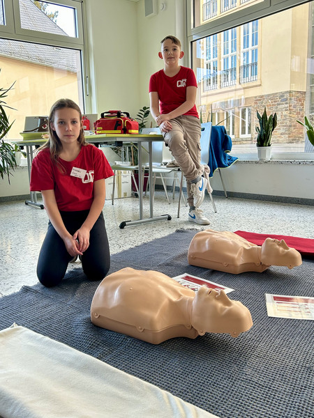 Auch ein Rettungswagen hatte in dieser Woche auf dem Schulgelände gehalten. Es gab keine Verletzungen, vielmehr ging es darum zu Lernen in Notsituationen richtig zu handeln. Die Malteser zeigten den Kindern, wie man im Ernstfall eine Person in die stabile Seitenlage bringt und einen Druckverband anlegt. Außerdem gab es eine Führung durch einen Einsatzwagen inklusive probeliegen auf der Rettungstrage.