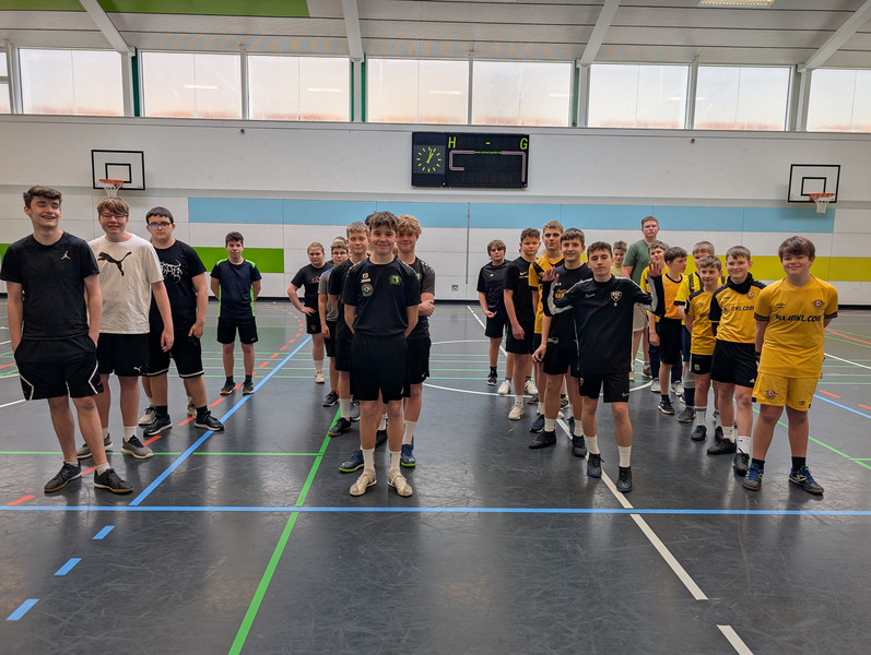 Bereits zum 7. Mal fand am 5. Februar 2025 unser Hallenfußballturnier „Budenzauber in Halsbrücke“ für die Klassen 7 und 8 statt. Teilnehmer waren in diesem Jahr die Klasse 7a und 7b dazu kamen die 8a und die 8b. In der 8c standen leider nicht genügend Fußballbegeisterte für eine Mannschaft zur Verfügung. Im Bild die Klassen bei der Turniereröffnung.