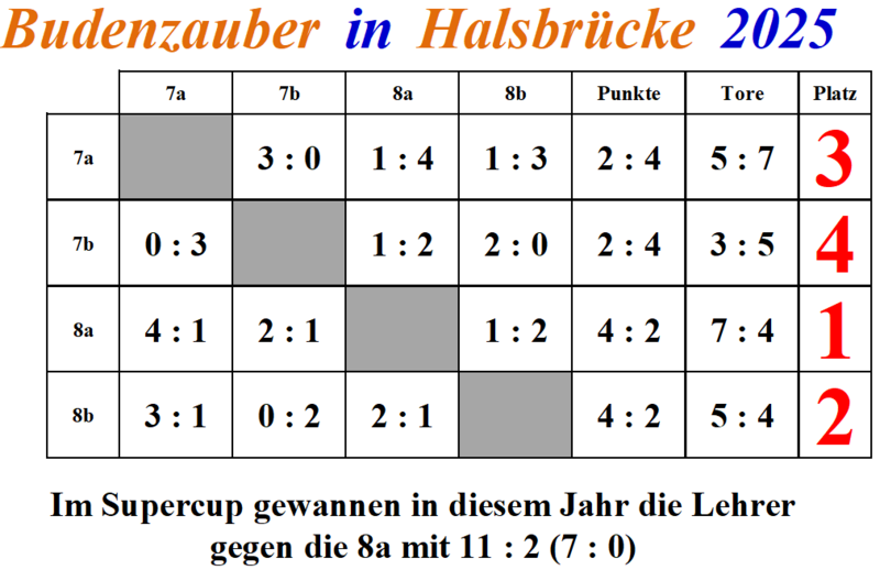 In spannenden und guten Spielen, in denen der Spielgedanke und der gegenseitige Respekt im Vordergrund standen, setzte sich am Ende die Klasse 8a durch die bessere Tordifferenz durch. Damit bekam die Klasse die Möglichkeit, sich mit dem Lehrerteam zu messen. Die Lehrer pressten von Anfang an hoch, drückten die 8er hinten rein und nutzten ihre Chancen konsequent. So war der Lehrersieg zu keinem Zeitpunkt in Gefahr.