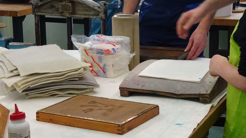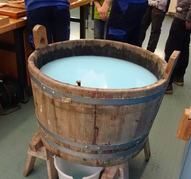 Die Schülerinnen und Schüler der Klassenstufe 6 widmeten sich dem Thema "Papier". So erforschten sie zum einen die Geschichte der Herstellung verschiedener Schreibmaterialien bis hin zum heute gebräuchlichen Papier, zum anderen aber auch dessen Herstellung. Hierbei wurden sie tatkräftig von Königsteiner Mitarbeitern der Papierfabrik Louisenthal unterstützt, die nicht nur gemeinsam mit den Kindern Papier schöpften, sondern ihnen auch mittels eines eindrucksvollen Films Einblicke in die heutige Papierproduktion ermöglichten.