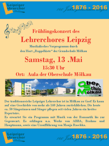 Am 13. Mai findet in der Oberschule Mölkau das Frühlingskonzert des Leipziger Lehrerchors statt.