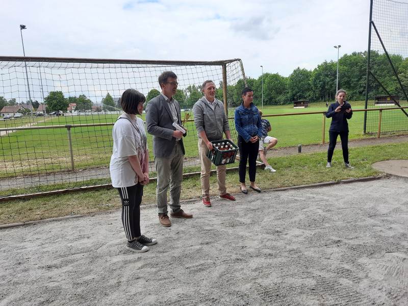 Auch der Bürgermeister der Gemeinde Malschwitz war vor Ort. Als Anerkennung übergab uns Herr Seidel den Pokal, eine Urkunde, eine Getränkekiste und einen Gutschein für die örtliche Bäckerei Trittmacher, worüber sich alle sehr freuten. Damit jede/r teilnehmende Schüler und Schülerin ein Stück abbekommt, stockte der Bürgermeister die Summe noch auf.