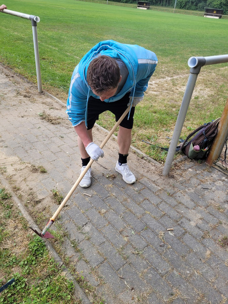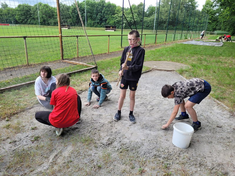 Aus der Sandgrube entfernten wir Eichensetzlinge und Unkraut. Große Äste, die über die Weitsprunganlage hingen, wurden abgesägt. Außerdem putze und fegte man die Wege. Auch die Kugelstoßanlage wurde von Unkraut und Setzlingen befreit.