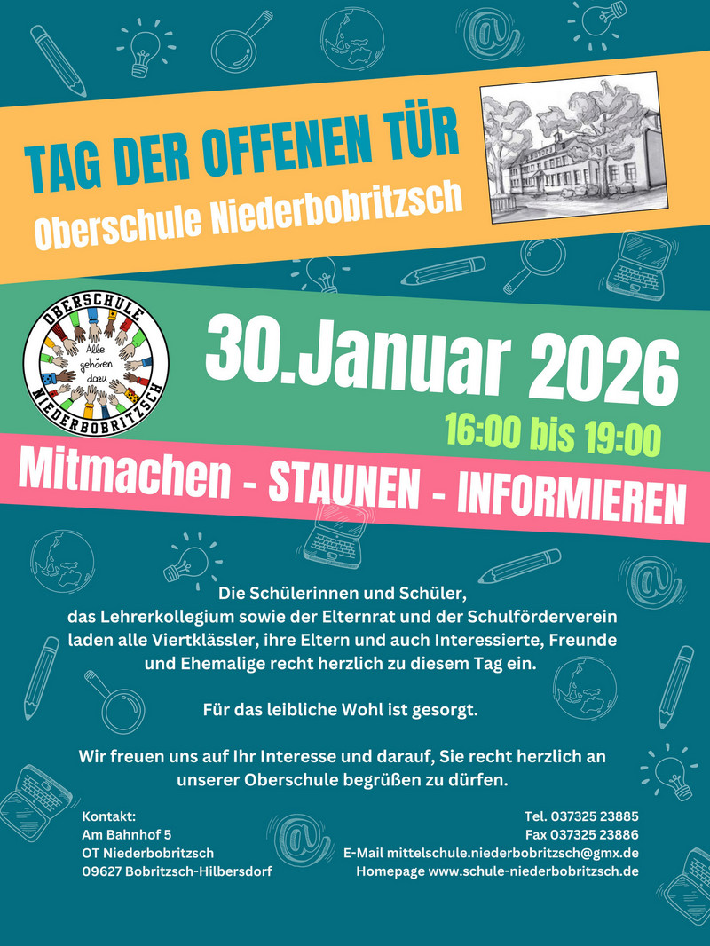 Das Kollegium der Oberschule Niederbobritzsch veranstaltet deswegen am 30. Januar 2026 einen "Tag der offenen Tür", um Ihnen und vor allem Ihrem Kind unsere Oberschule vorzustellen.