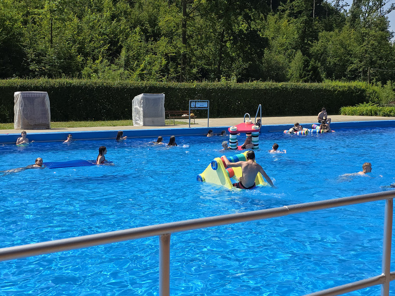 Gleich zu Beginn, am Montag, schwang sich die Gruppe auf ihre Fahrräder und machte sich auf den Weg ins Freibad nach Falkenau. Dort wurde geplanscht, gespielt und natürlich die Sonne genossen – ein perfekter Start in die Ferienzeit!