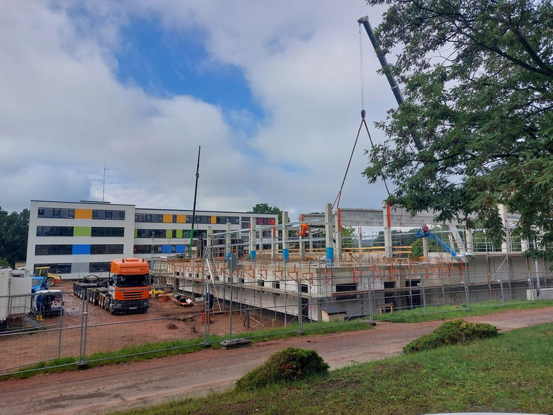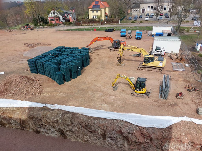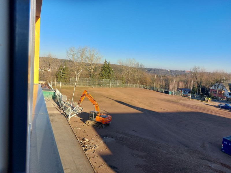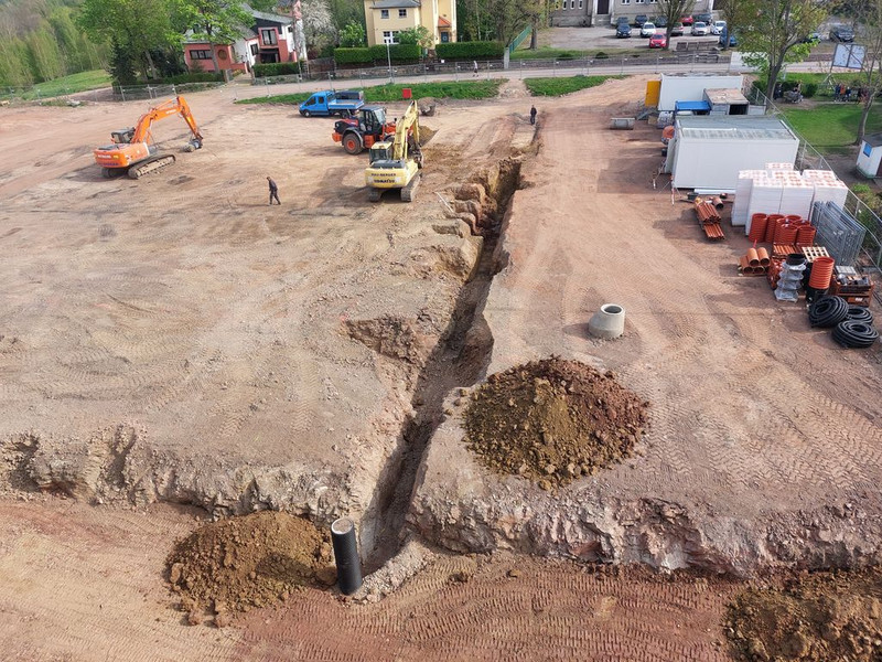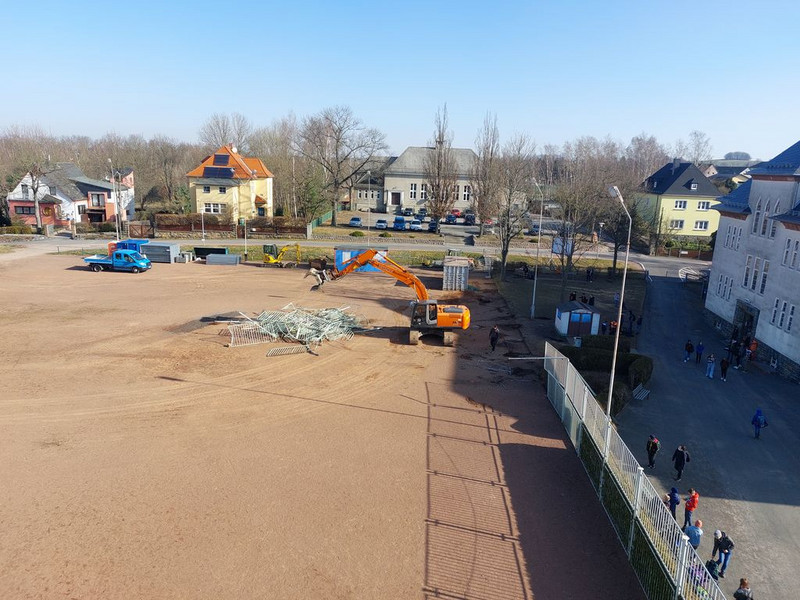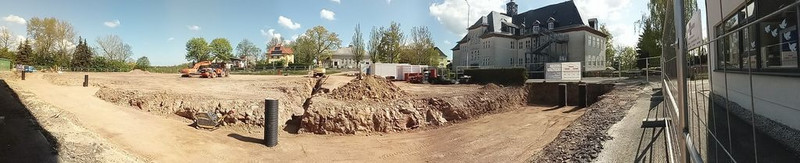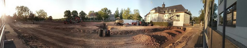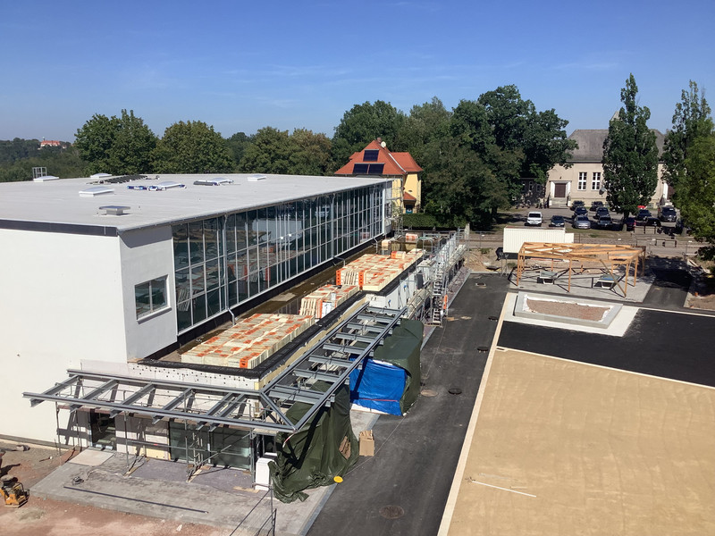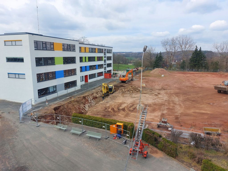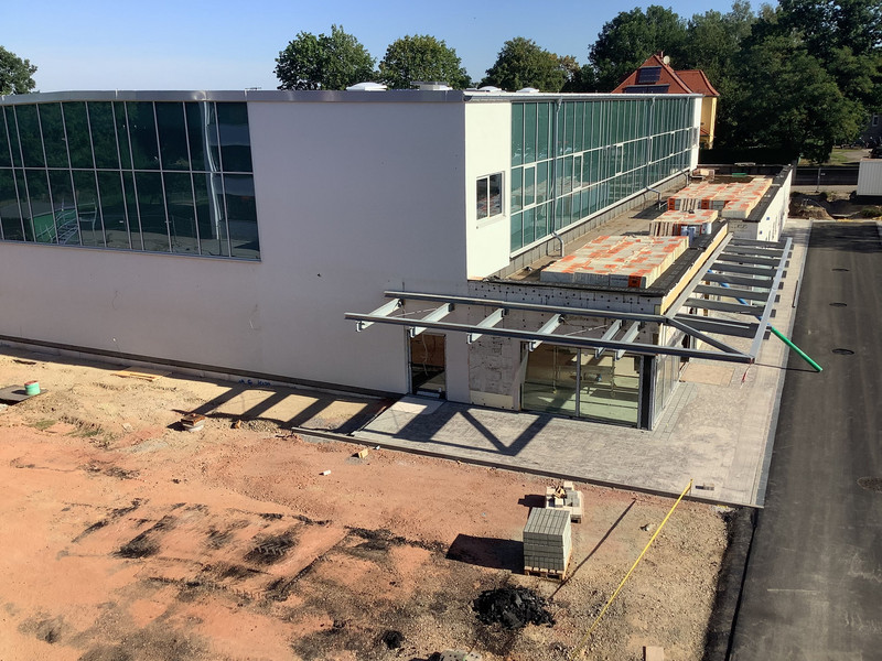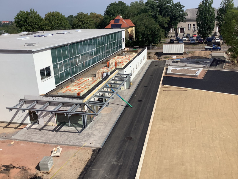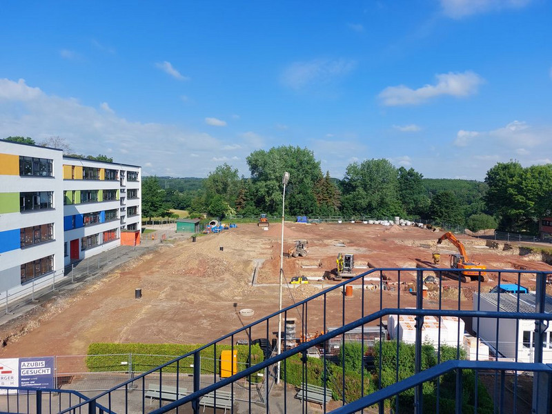 Manches sieht man ganz deutlich, wie zum Beispiel das Wachsen unserer Turnhalle. Hier stehen nun neben den Außenwänden auch Innenwände und man hat beim Blick aus den beiden Schulgebäuden das Gefühl, von oben bereits in die zukünftigen Räume, wie Kabinen, hineinschauen zu können.