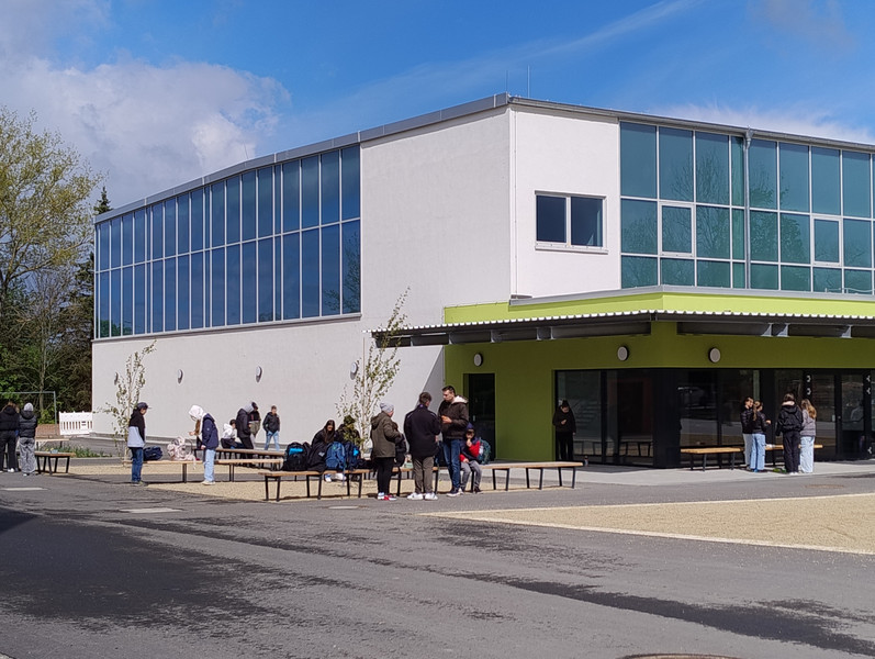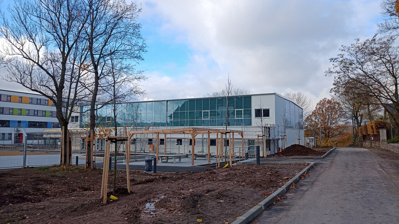 So ganz allmählich neigt sich die Bauphase ihrem Ende entgegen. Der Innerraum unserer neuen Sporthalle scheint beinahe fertig für die ersten Sporteinheiten, während das Vordach über dem Eingangsbereich noch bearbeitet wird. Auch der Außenbereich nimmt Gestalt an, Sitzgelegenheiten und Fahrradständer sowie verschiedene, frisch gepflanzte Bäume lassen erahnen, wie das Gelände in der Zukunft einmal aussehen und genutzt werden kann. Selbst die alte Buchenhecke am „Grünen Klassenzimmer“, welche einem Durchgang Platz machen musste, weist nun keine Löcher mehr auf. Es geht auf die Zielgerade zu!