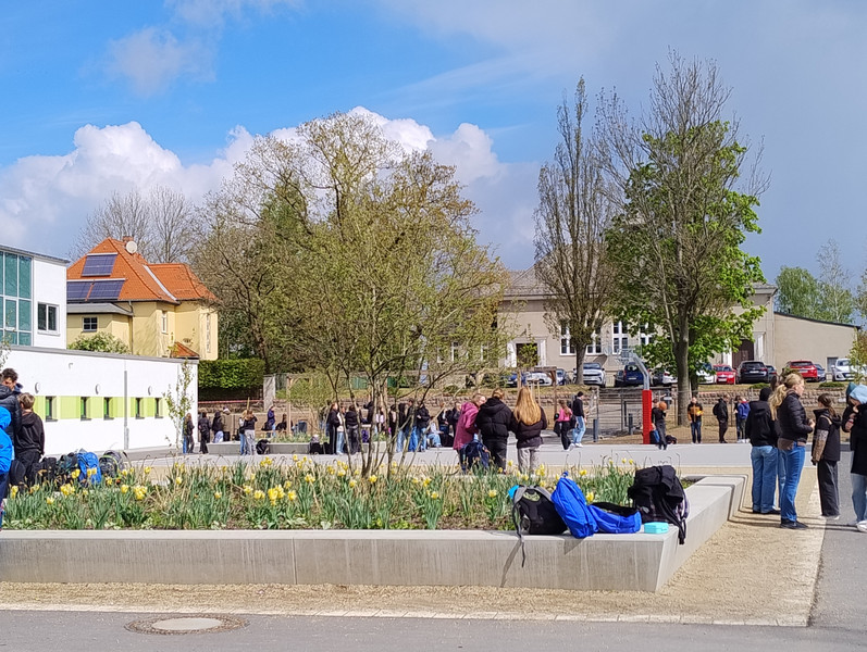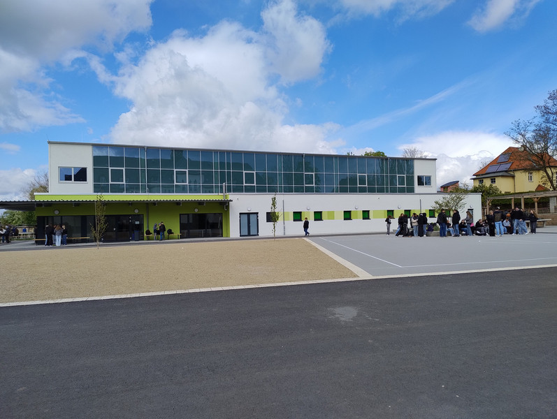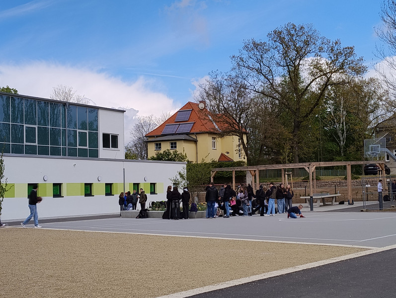 Im Moment dominiert der Asphalt und wenn man an einen belebten Schulhof, der zum Erholen und Verweilen einlädt, denkt, braucht man im Augenblick wirklich viel Fantasie. Einzig 2 Tischtennisplatten und ein Basketballkorb lassen den Zweck der Fläche erahnen. Wollen wir hoffen, dass Bäume und Pflanzen das z.Z. noch triste Ambiente demnächst mit Leben erfüllen!