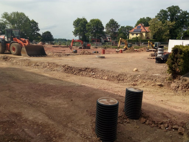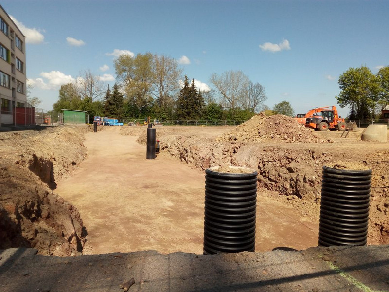 Anderes, nämlich die Erdarbeiten, welche den Anschluss der Regenrückhaltebecken an das örtliche Regen-/Abwassersystem realisierten, ist nicht mehr zu sehen. Während der Ferien wurde hierfür unser Grünes Klassenzimmer in einen Canyon verwandelt. Doch pünktlich zu Schulbeginn sind nun fast alle Spuren wieder beseitigt und sicher können wir Tischtennisplatte und Sitzgelegenheiten im Grünen bald wieder nutzen.