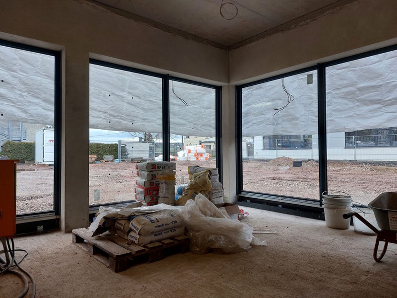 Es wachsen Wände in die Höhe und die ersten Glasscheiben werden eingesetzt.