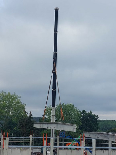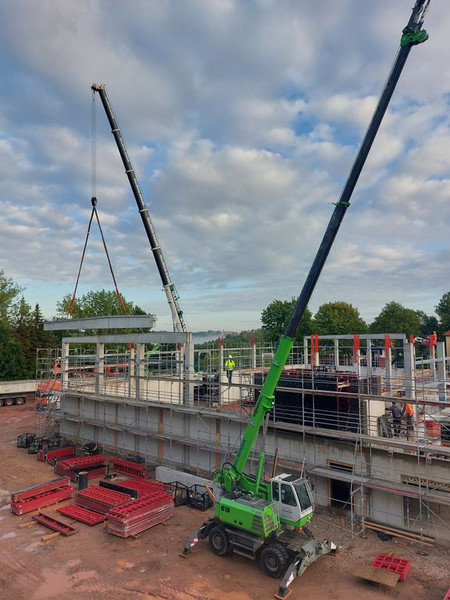 Nachdem Fundament und Wände die letzten Wochen im Mittelpunkt standen, wird nun, ein halbes Jahr nach Spatenstich, am Dach gearbeitet. Mit beeindruckenden Tiefladern und Kränen wurden die Betonelemente für die Dachkonstruktion diese Woche angeliefert und verarbeitet. Viele neugierige Augenpaare bestaunten das Einsetzen der riesigen und tonnenschweren Bauelemente.