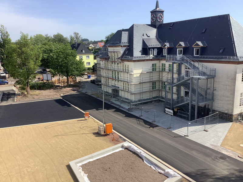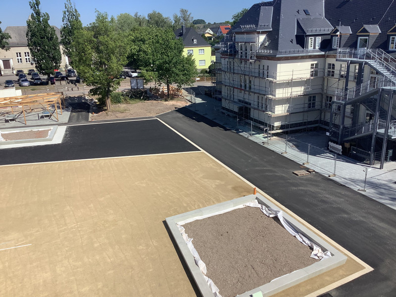 In den sechs Wochen Ferien wurde vor allem der Außenbereich der Turnhalle, unser zukünftiger Schulhof, in Angriff genommen. Schwere Baumaschinen gaben dem ehemaligen Hartplatz ein neues Gesicht. Im Moment werden die Asphaltierungsarbeiten gerade abgeschlossen und wenn demnächst noch ein wenig Grün (Sträucher, Bäume) auf dem Campus Einzug hält, kann man sich diesen als Erholungsfläche in den Pausen gut vorstellen.