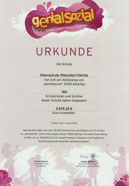 Traditionell haben unsere Schülerinnen und Schüler in der letzten Schulwoche des vergangenen Schuljahres am Projekt „Genial Sozial – Deine Arbeit gegen Armut“ teilgenommen. Mit großem Einsatz, Kreativität und Durchhaltevermögen konnten sie eine beeindruckende Summe von 5.876,35 Euro erarbeiten. Dieses Geld unterstützt soziale Projekte im Freistaat Sachsen und trägt dazu bei, Menschen in schwierigen Lebenssituationen zu helfen.