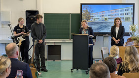 In ihrer anschließenden Eröffnungsrede sprach unsere Schulleiterin Frau Noltemeier über die Idee und den Wunsch nach einem identitätsstiftenden Namenszusatz. Sie betonte, wie wichtig ein Name für das Zusammengehörigkeitsgefühl einer Schulgemeinschaft sei – ein Zeichen von Wertschätzung, Standortverbundenheit und Vision für die Zukunft.