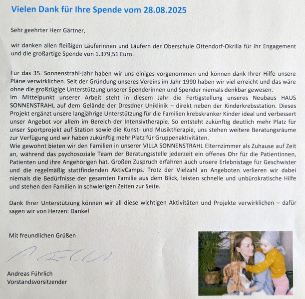 Der Sonnenstrahl e.V. dankt für unsere Unterstützung durch den "Spendenlauf"