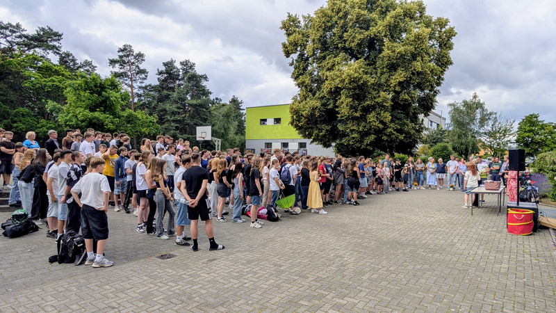 Am letzten Schultag vor den Sommerferien versammelte sich die gesamte Schulgemeinschaft zu einem feierlichen Appell auf dem Schulhof, um das Schuljahr abzuschließen und sich auf die Ferien einzustimmen.