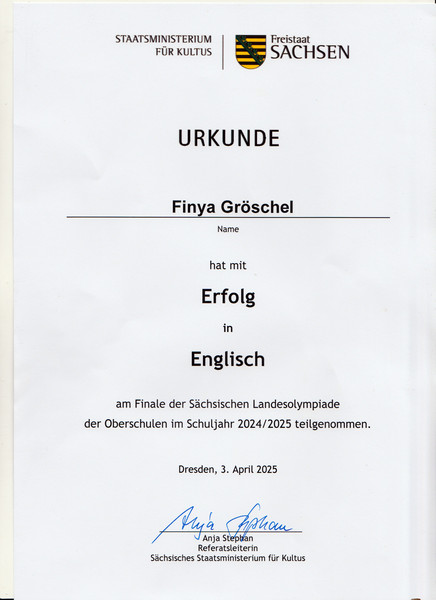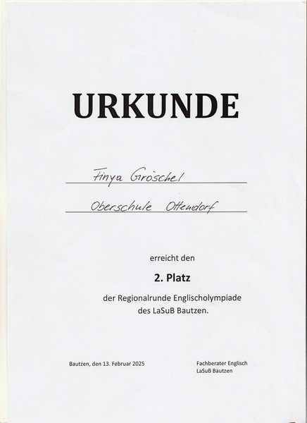 In diesem Jahr hat Finya Gröschel aus der 9a die Oberschule Ottendorf-Okrilla würdig bei der Englischolympiade vertreten. Nachdem Finya in der Kreisrunde in Bautzen den zweiten Platz erreichte, durfte sie ins Sächsische Staatsministerium für Kultus nach Dresden fahren und nahm dort mit Erfolg an der Landesolympiade teil.