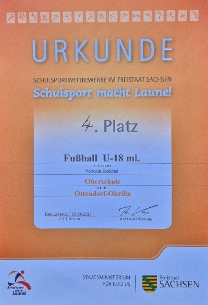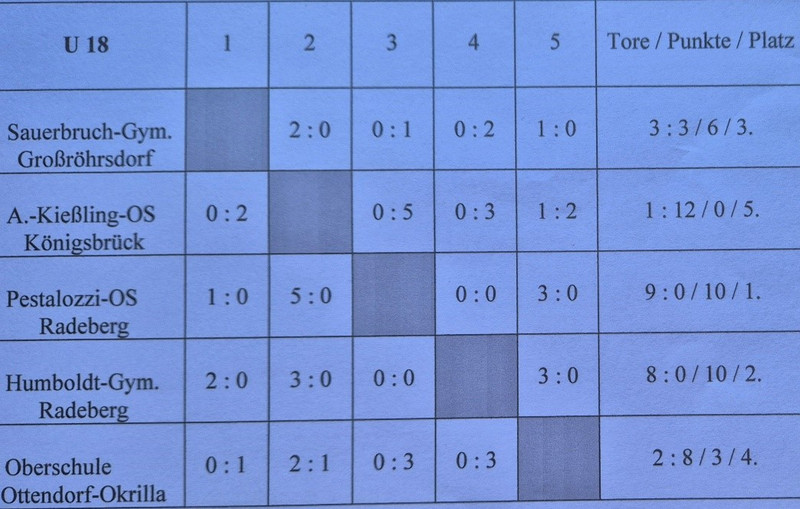 Unser erstes Spiel gegen das Gymnasium Großröhrsdorf verlieren wir in der letzten Sekunde mit 0:1, obwohl wir das Spiel klar dominierten. Es folgten zwei weitere Niederlagen. Im letzten Spiel gegen die Hausherren aus Königsbrück lagen wir 0:1 hinten. Dann kam Rico Pfeiffer, unser Bürgermeister, im Fanblock an. Und siehe da: zwei schöne Tore für die Jungs aus Ottendorf-Okrilla. Mit einem versöhnlichen 2:1, welches unser Torwart Tom-Elias aus 50m schoss, waren wir getröstet. Also: „parteilose Politiker bringen manchmal Glück“.