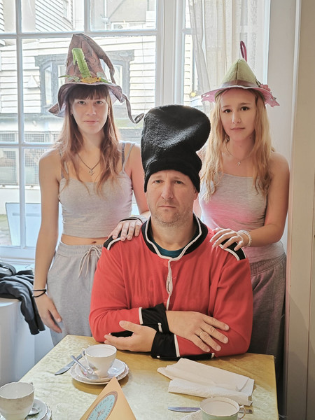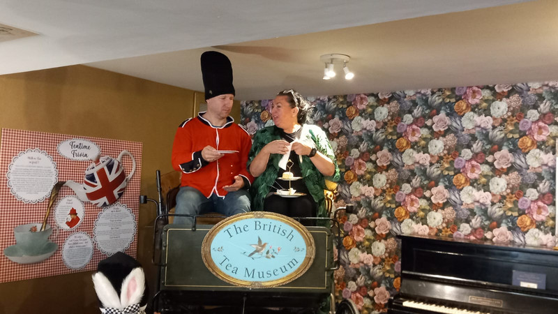 When we arrived, we were warmly welcomed. It was a room with pictures painted on the walls and many tables and couches. Every chair had a funny hat or costume lying on it. We sat down at a table and were served an orange tea that Princess Camilla and Prince Charles had at their wedding. After that, we could choose from various teas, and we got to try scones. In the UK, you usually eat them while drinking tea. They’re small pastries that you eat with cream and jam. They’re really good! After tea, they played music, and everyone started dancing. It was so much fun.