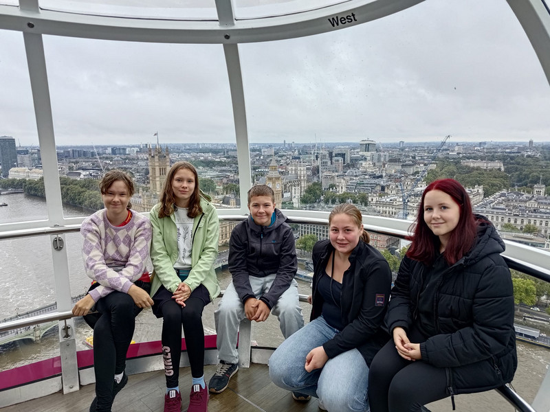 Our first destination was the London Eye. We had to wait a bit because the line was very long, and we used this time to have breakfast. Then we took off, a few students and two teachers in each gondola. The gondolas slowly went higher and higher, and the view was wonderful. You could see Big Ben, Buckingham Palace, and much more from above. But as quickly as the journey had started, it was over.