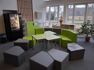 Um den Schülern das Warten auf den Bus oder ihr GTA etwas schöner zu gestalten und ihnen die Möglichkeit zu geben, Hausaufgaben zu erledigen oder Spiele zu spielen haben wir für die Aula neue Lounge-Möbel gekauft. Wir hoffen, die Mädchen und Jungen gehen sorgsam damit um, sodass wir lange Freude daran haben können.