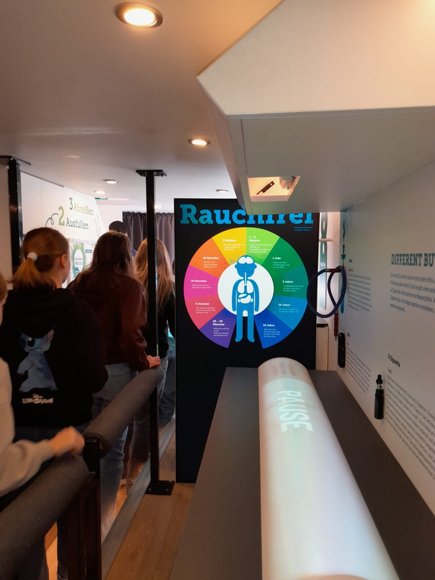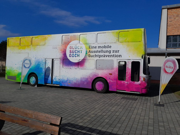 Und auch der „Glücksbus“ parkte für zwei Tage mal wieder auf unserem Schulhof. Unter dem Motto „GLÜCK SUCHT DICH“ gab es im Bus verschiedene Stationen zum Thema Sucht. Im Slogan ist nämlich nicht „suchen“ gemeint sondern „Sucht“. Nicht nur Rauchen , Alkohol- oder Drogenkonsum sind Süchte, auch Belohnungssysteme im Internet können abhängig machen. Wie schmal der Grat zwischen gut und böse dabei sein kann, erstaunte die Mädchen und Jungen schon. Wir hoffen, dass sie nach dem Besuch im Bus aufmerksamer ihr Tun hinterfragen und gegenüber den zahlreichen Versuchungen im Alltag gewappnet sind.