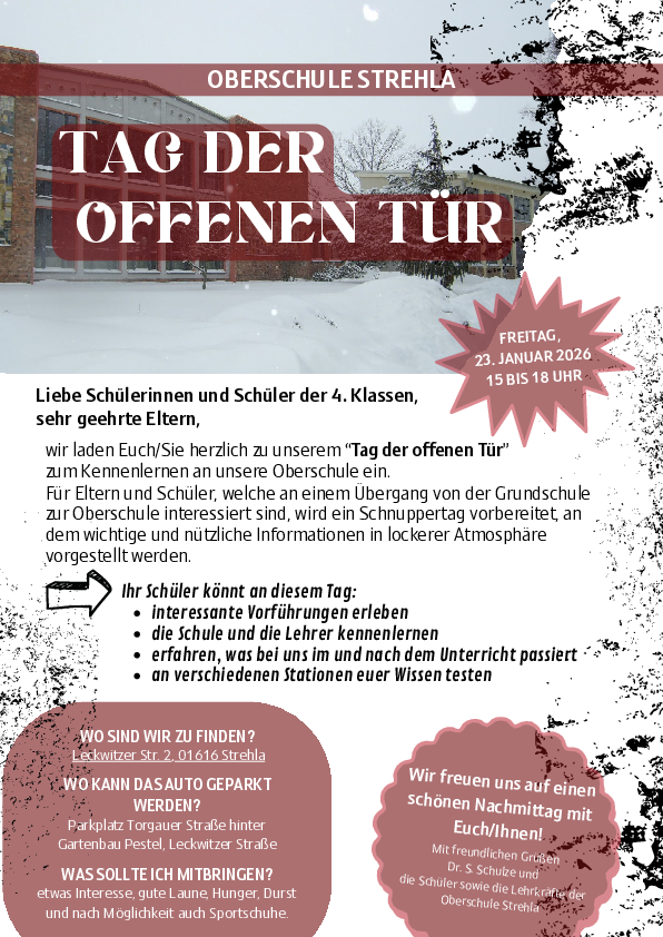 Am Samstag, 25.01.2025 findet in der Zeit von 10.00 Uhr – 13.00 Uhr ein Schnuppertag an unserer Schule statt. Eingeladen sind ganz herzlich die Schüler der 4. Klassen und ihre Eltern.