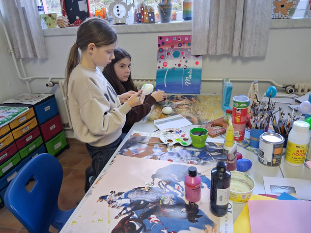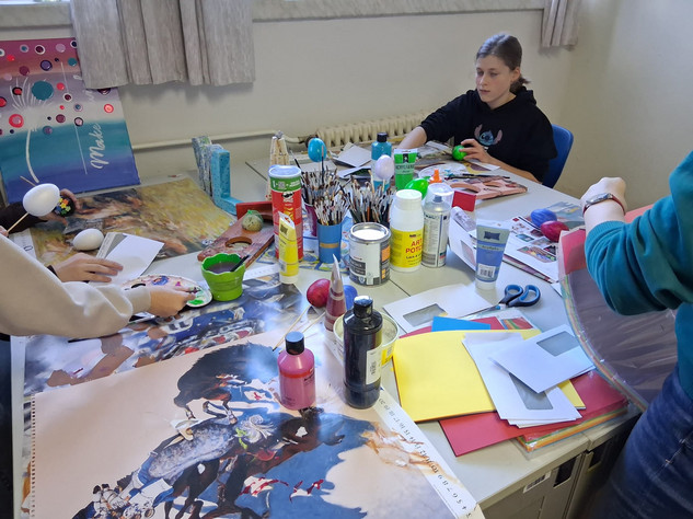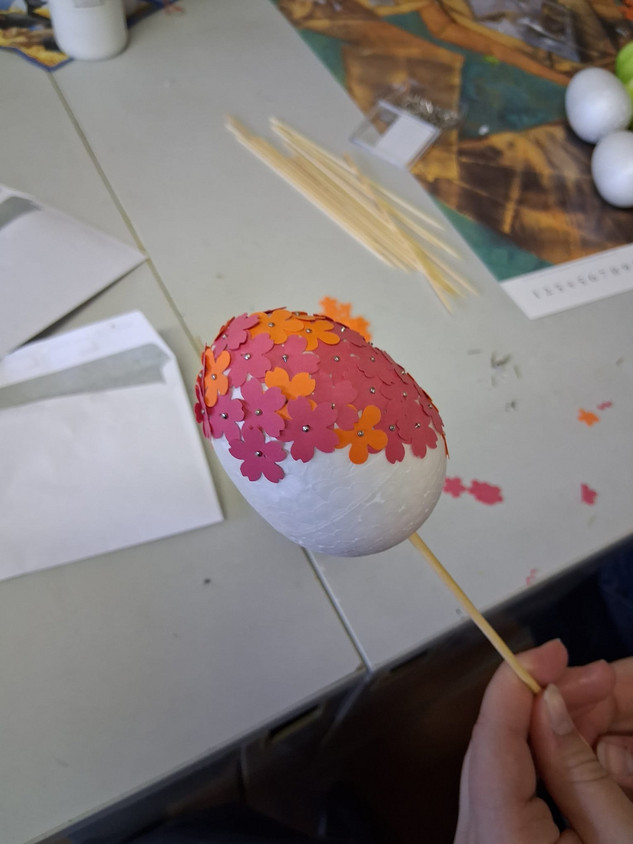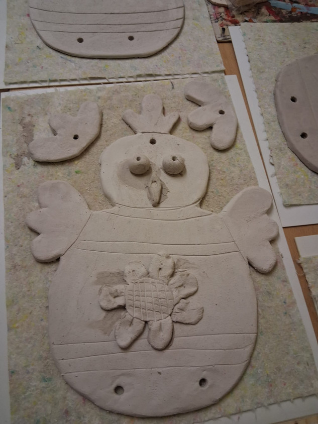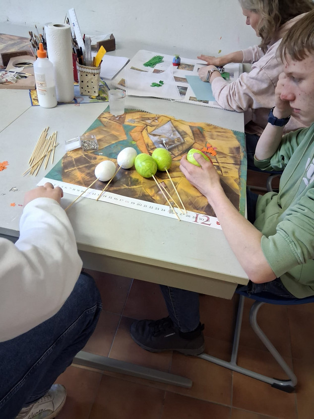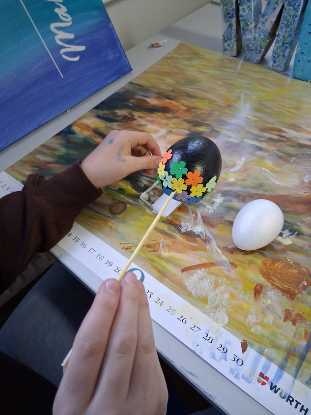 Ein Osterprojekt liegt nun schon zum Trocknen vor dem Schrühbrand parat. Wir haben ein lustiges Osterhuhn als Türanhänger oder aber auch als Aufsteller für einen Blumenkübel getöpfert. Nach dem Brennen werden unsere Hühnchen noch farblich gestaltet und ein zweites Mal gebrannt. Sie sind dann auf alle Fälle geeignet, im Freien für das richtige Osterfeeling zu sorgen. Unser zweites Osterprojekt werden Blütenostereier sein. Styroporeier werden farblich grundiert, mit Papierstanzern werden verschiedene Blütenformen aus farbigen Papier ausgestanzt und mit kleinen Nadel auf das Ei gesteckt.