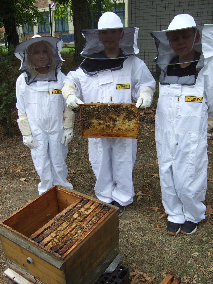 Nach dem Anlegen der Schutzkleidung ging es direkt zu den Bienenstöcken. Die jungen Honighändler lernten ihre summenden Mitbewohner kennen und erfuhren erste spannende Fakten über das Leben im Bienenvolk.