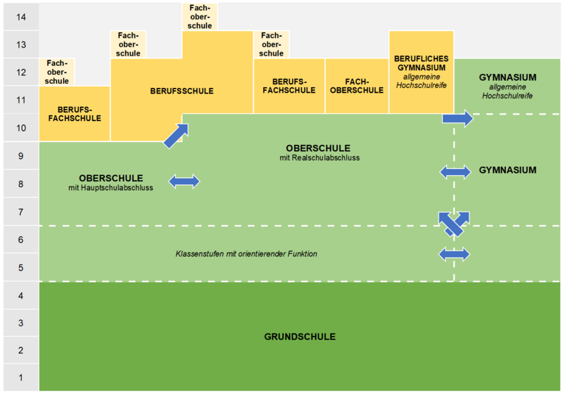 Die Klassenstufen 5 und 6 haben Orientierungsfunktion. Die Lehrpläne sind weitgehend identisch und ein Wechsel zwischen den Schularten Oberschule und Gymnasium ist daher problemlos möglich. Grundsätzlich ist ein Wechsel auch in höheren Klassenstufen möglich, wird jedoch wegen der zunehmenden Unterschiede der Bildungsgänge in den Schularten schwieriger. Die möglichen Wechsel zwischen den verschiedenen Schularten sind in der Übersicht durch blaue Pfeile gekennzeichnet.