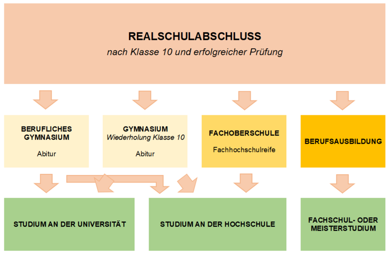 - Mit bestimmten Leistungsvoraussetzungen kann nach dem Realschulabschluss das Gymnasium, das berufliche Gymnasium oder eine Fachoberschule (z.B. in medizinischen, pädagogischen und Verwaltungsfachberufen) besucht werden.