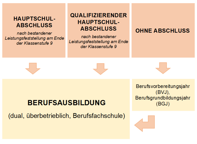 - Nach dem Hauptschulabschluss erfolgt i.d.R. eine duale Berufsausbildung. In den seltenen Fällen des Nichterreichens des Hauptschulabschlusses folgt das Berufsvorbereitungsjahr an einer Beruflichen Schule.