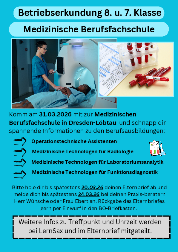 | 31.03.2026 | Betriebserkundung zur Medizinischen Berufsfachschule |