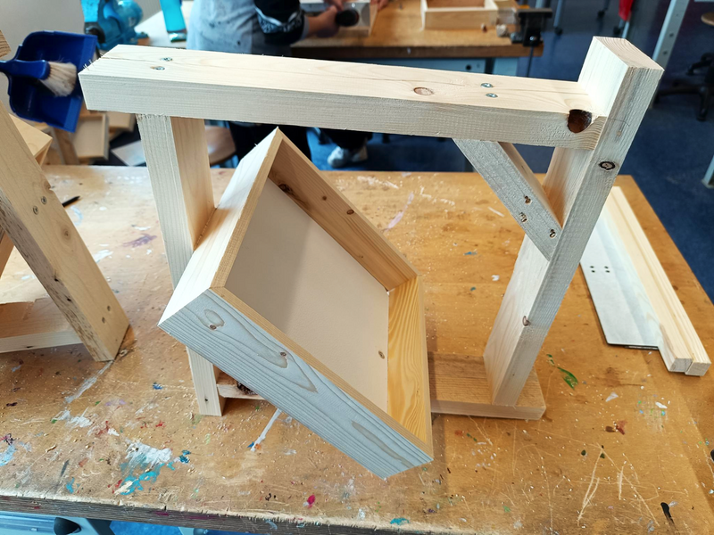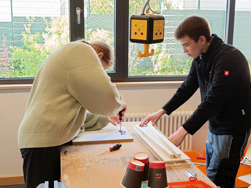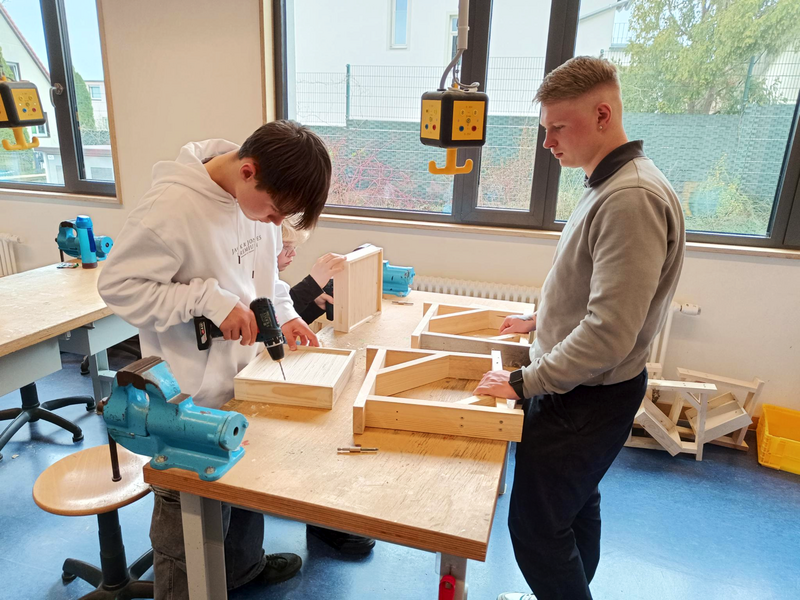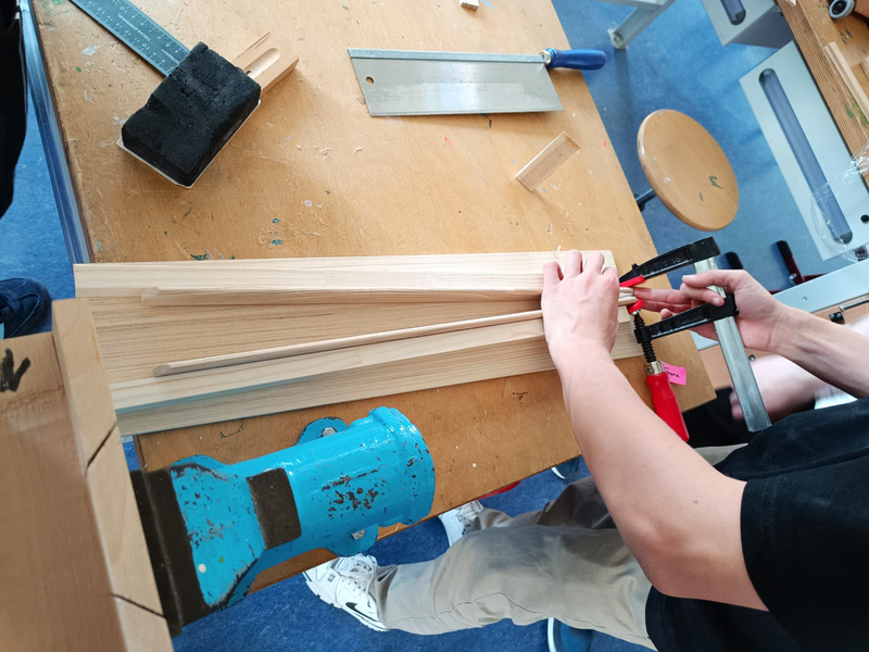 Mit viel Engagement und Begeisterung machten sich die Schülerinnen und Schüler ans Werk und wurden dabei Schritt für Schritt von den Azubis angeleitet. Dabei wurde gesägt, um die Holzteile auf die richtige Länge zu bringen. Auch kam die Akkubohrmaschine zum Einsatz, um Löcher für Schrauben und Befestigungen zu bohren. Des Weiteren fixierten sie die Holzteile mit Schraubzwingen, um beim Zusammenbau des Werkstückes Stabilität zu gewährleisten.