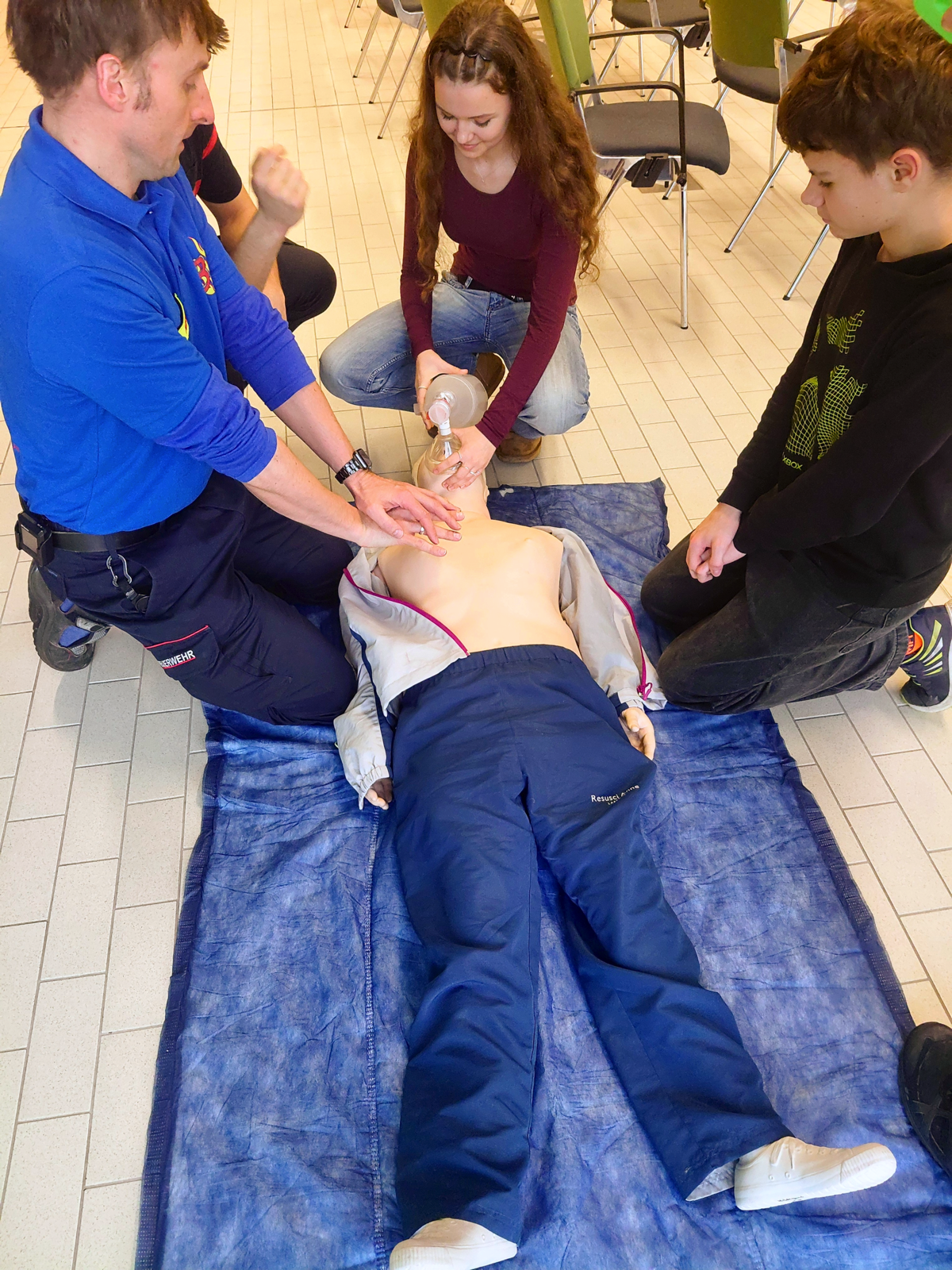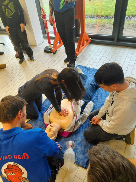 Anschließend erhielten die Schülerinnen und Schüler eine anschauliche Einführung in die lebensrettenden Sofortmaßnahmen der Wiederbelebung. Mithilfe einer speziellen Übungspuppe lernten die Schülerinnen und Schüler die Herzdruckmassage sowie die Beatmung kennen und durften diese auch selbst ausprobieren. Diese praktische Erfahrung vermittelte wichtige Grundlagen in Sachen Erste Hilfe.