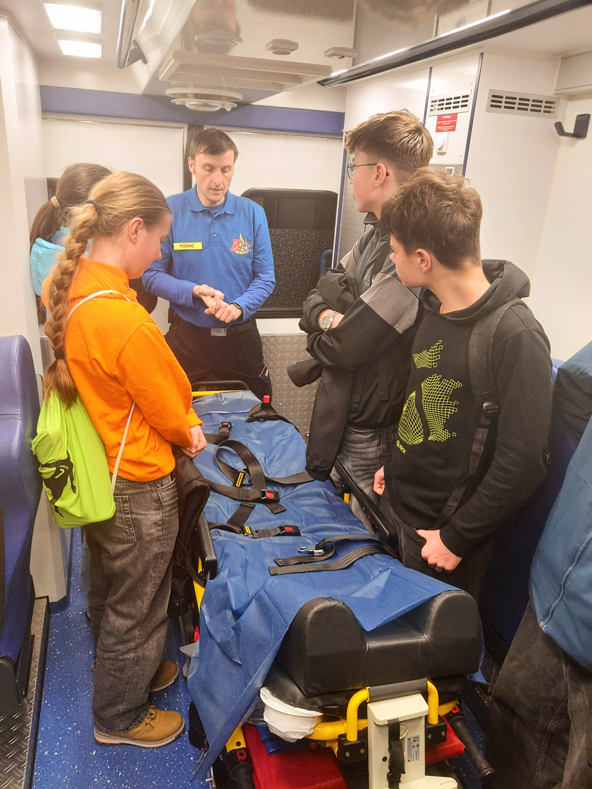 Darauf folgend hatten die Schülerinnen und Schüler die Möglichkeit, sich in der Feuer- und Rettungswache umzusehen. Sie erkundeten einen Rettungswagen und erfuhren, welches medizinische Equipment im Einsatz benötigt wird. Auch ein Feuerwehrfahrzeug sowie die dazugehörige Ausrüstung wurden ausführlich vorgestellt.