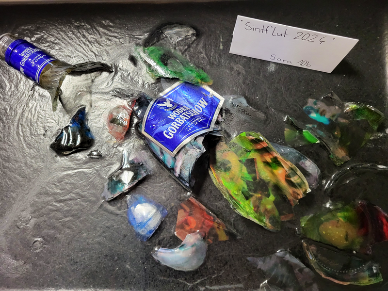 Für das diesjährige Kreativprojekt zu Beginn des Schuljahres warteten auf die 10b mehrere leere Flaschen zum Gestalten. Glas ist bekanntlich kein einfaches Material und es sollte dennoch aus jeder Flasche ein Kunstobjekt entstehen. Nun hieß es Ideen finden, diese zu Papier bringen und danach ran an die Flasche. Draht und Gipsbinden waren eine gute Materialgrundlage, Farbe spielte auch eine große Rolle. Nicht alles ist perfekt, aber kann sich sehen lassen.