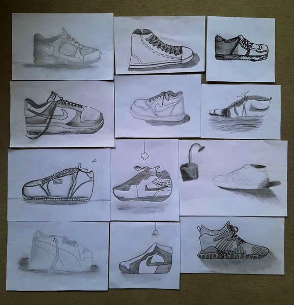 Das schien der beim Zeichnen der Schuhe etwas leichter, hier lag der Fokus auf den sichtbaren oder tiefer liegenden Flächen und es wurde wieder mit dem Schatten gearbeitet, der den Schuh ins perfekte Licht rückt.