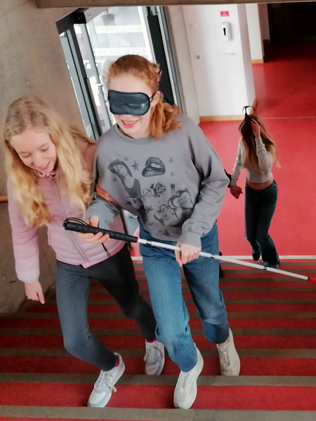 Im Anschluss konnten die Schülerinnen und Schüler im Rahmen einer Schulrallye selbst aktiv werden. Mit speziellen Simulationsbrillen, die verschiedene Sehbeeinträchtigungen wie z. B. den Tunnelblick oder Grauen Star nachempfinden, erlebten sie, wie stark die Wahrnehmung und Orientierung dadurch eingeschränkt sein kann. Auch das Fahren mit dem Rollstuhl auf dem Schulgelände war für viele eine ganz besondere Erfahrung. Schon kleinste Hindernisse, wie Türschwellen oder enge Gänge, wurden zu echten Herausforderungen. Mit einem Blindenstock ausgestattet, konnten die Schülerinnen und Schüler zudem ausprobieren, sich mit verbundenen Augen (blind) durch bekannte Schulbereiche zu bewegen – natürlich immer begleitet von einer weiteren Person.