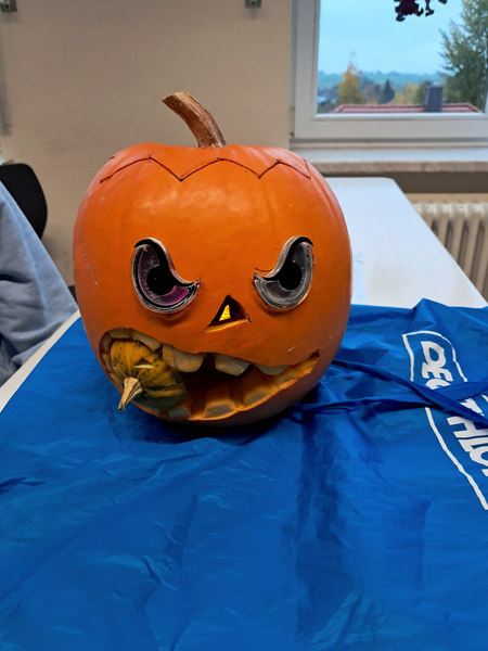 Kurz darauf legten wir ein Stopp in der Aula ein, wo wir uns genauer die wunderschönen Kürbisse anschauten. Des Weiteren guckten wir uns an wie das Buffet aufgebaut wurde. Danach war schon Pause, welche wir jedoch aktiv nutzten, um uns ein paar Kostüme für den späteren Kostümwettbewerb anzusehen. Außerdem halfen wir dabei Stimmen für den Kürbiswettbewerb zu sammeln.