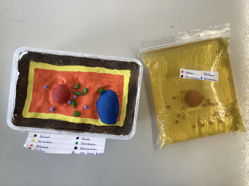 Jonas aus der Klasse 6a hat am Freitag seine Zellmodelle vorgestellt und dabei sehr viel Kreativität gezeigt. Er hat bei der Herstellung beachtet, dass die Zellbestandteile freibeweglich sind. Beim Modell der Pflanzenzelle sind die Mitochondrien und Chloroplasten nicht fest integriert in die Masse und bei der Tierzelle wurden alle Bestandteile in eine Tüte (als Zellmembran) gegeben, die mit einer Flüssigkeit gefüllt wurde, die das Zellplasma darstellt.