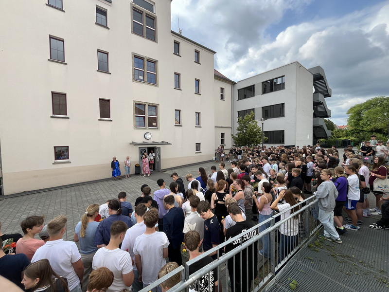 Sehr emotional und feierlich war die Verabschiedung von Frau Doherr und Frau Turba in ihren wohlverdienten Ruhestand am letzten Schultag des Schuljahres 2024/25. Alle Schüler und Lehrer bedanken sich mit einer tollen Aktion bei den Beiden Von jedem Schüler gab es einen Blumengruß.