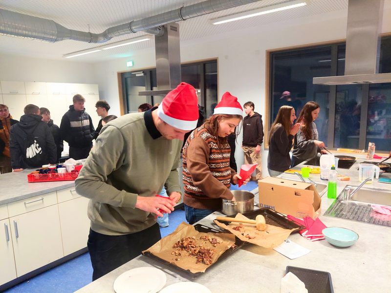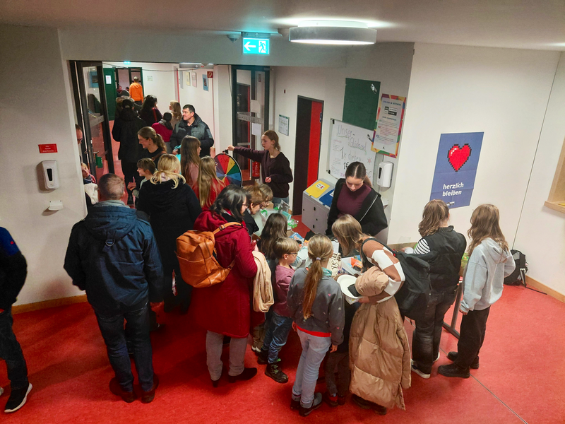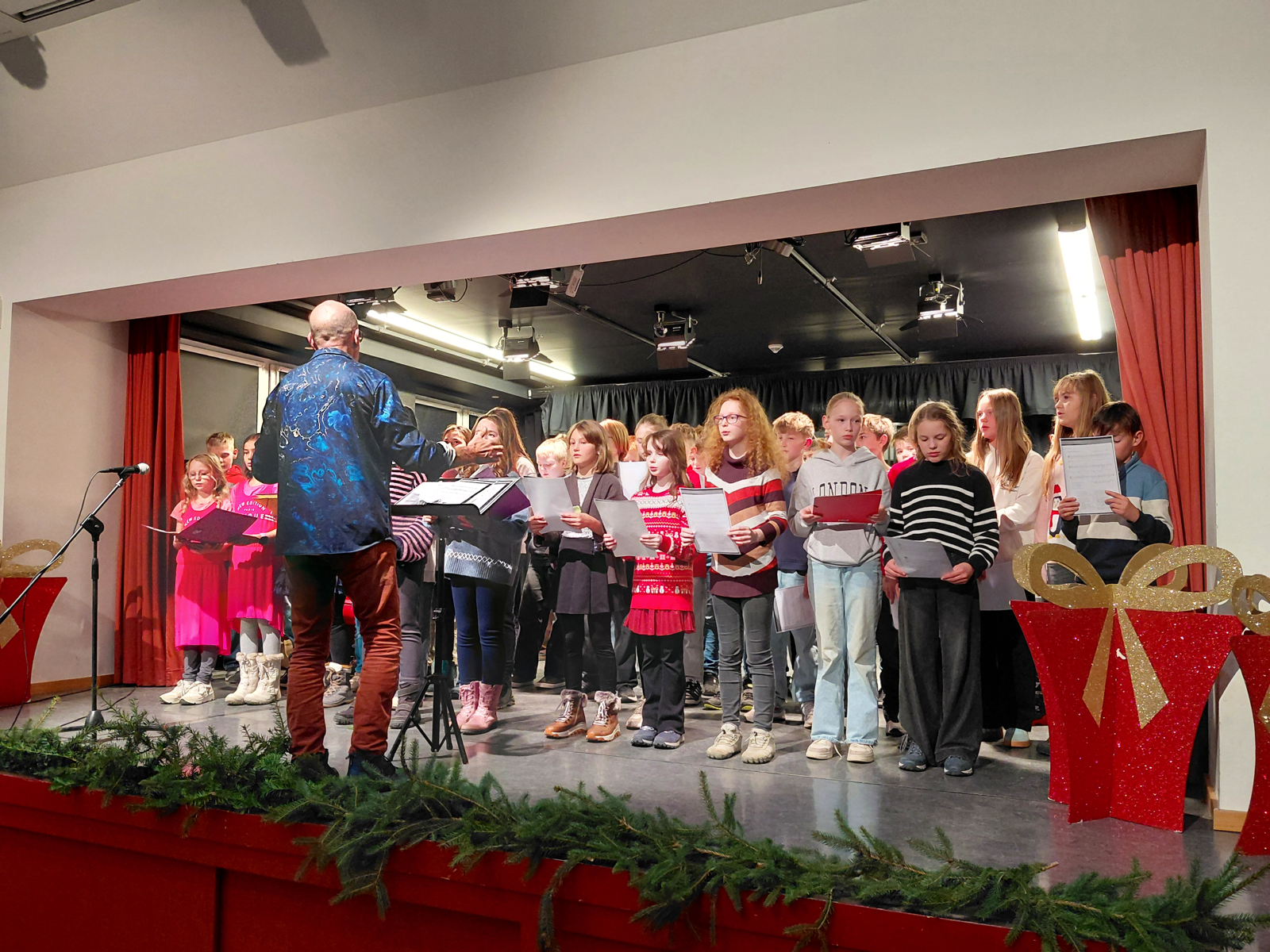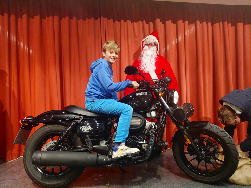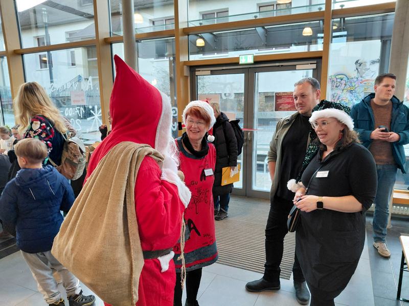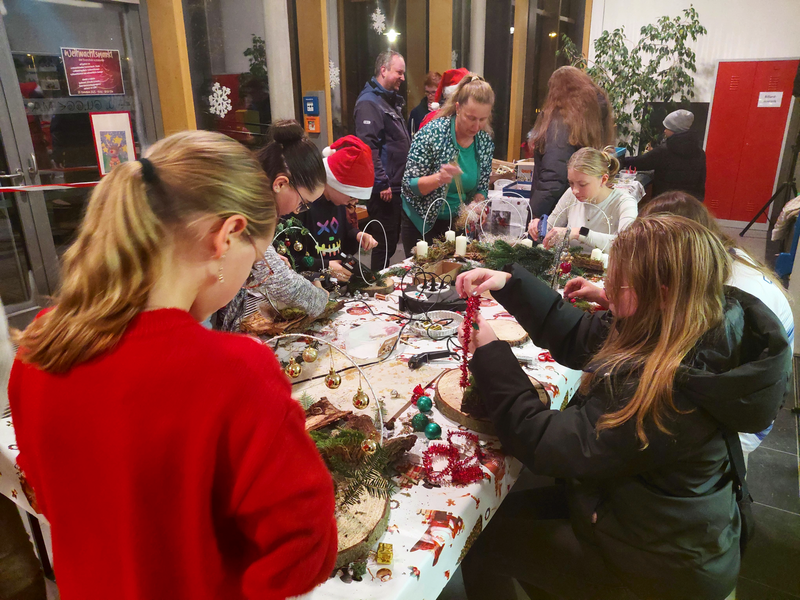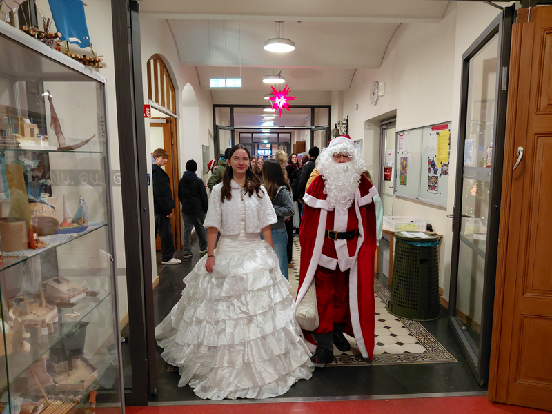 Am 27.11.2025 fand unser traditioneller Weihnachtsmarkt statt. Die Christbäume in der Pausenhalle und der Aula leuchteten im hellen Glanz, ganz toll von der Klasse 8a geschmückt. Auch der Weihnachtsmann war dieses Jahr wieder mit dem Motorrad da und war erneut ein beliebtestes Fotomotiv. Die 5. Klassen erfreuten unsere Besucher mit einem kleinen Weihnachtsprogramm auf der Bühne und viele schöne Dinge, wie Weihnachtsanhänger, Tannenbäumchen aus Papier, Engel aus Nudeln oder Glas und tolle Adventsgestecke oder -Ringe konnten u.a. gebastelt werden.