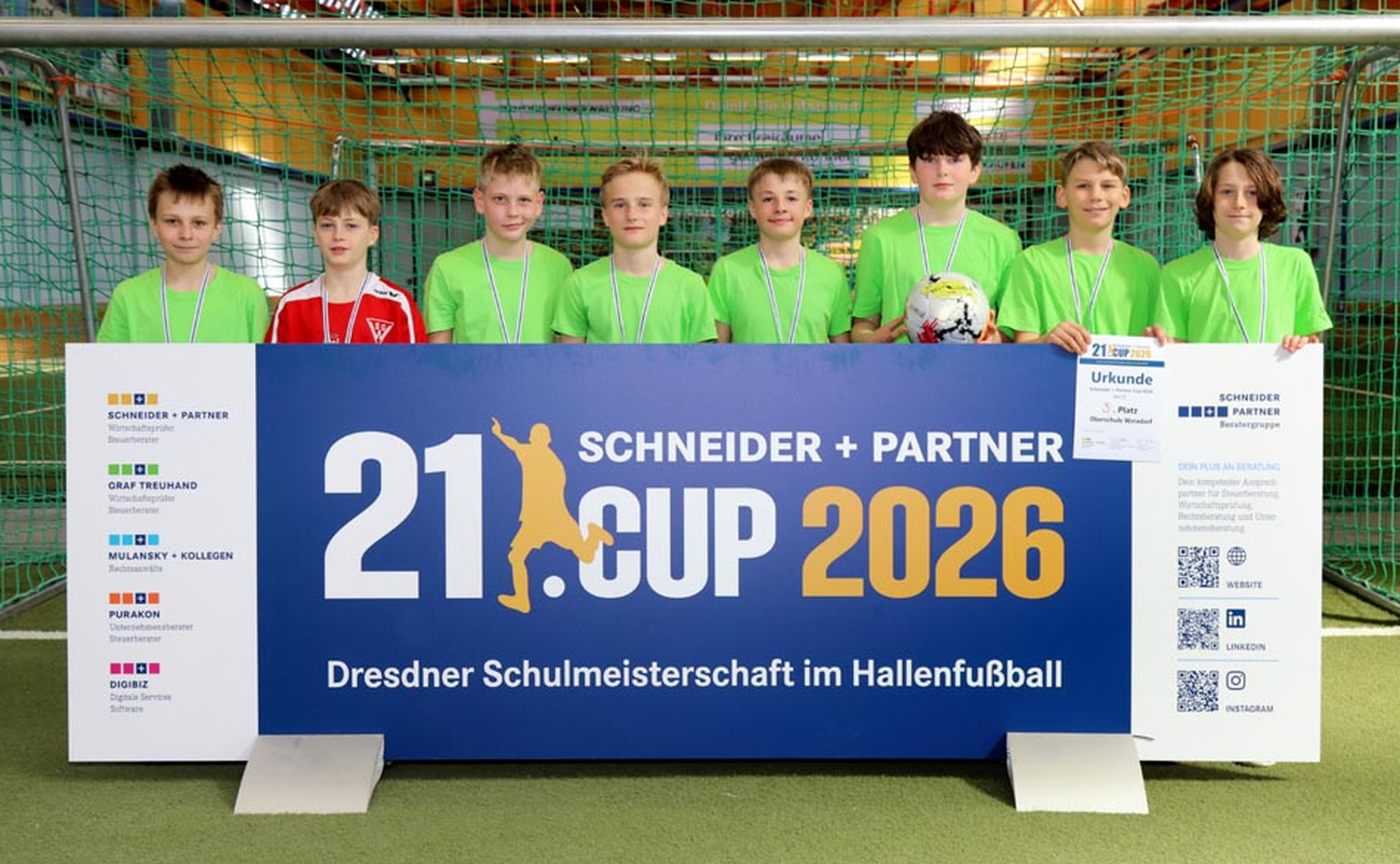 Noch vor den Osterferien gelang unseren Jungs der Jahrgänge 2013–2015 ein starker Auftritt: Mit drei Siegen und einer unglücklichen Niederlage in der Gruppenphase sicherten sie sich als Tabellenzweiter den Einzug ins Halbfinale. Dort unterlagen sie der 116. Oberschule, dem späteren Turniersieger. Im Spiel um Platz 3 bewiesen die Jungen jedoch noch einmal ihre Klasse und sicherten sich verdient einen Medaillenrang. Mit ihrem erfrischenden Angriffsfußball hoben sie sich spielerisch besonders positiv hervor.
